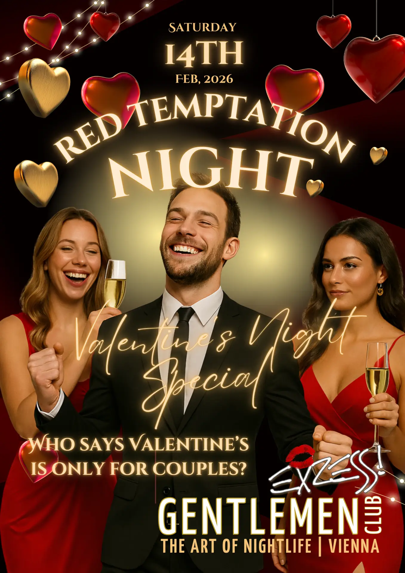 Wer sagt, dass der Valentinstag nur für Paare ist? Feiern Sie mit uns die Nacht der Versuchung in exklusivem Ambiente! Wann? Samstag, 14. Februar 2026. Genießen Sie einen Abend voller Eleganz und Stil!